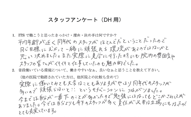 歯周病の認定を取りたいと思っているからです。教育体制も整っているのでITSで働きたいと思いました。